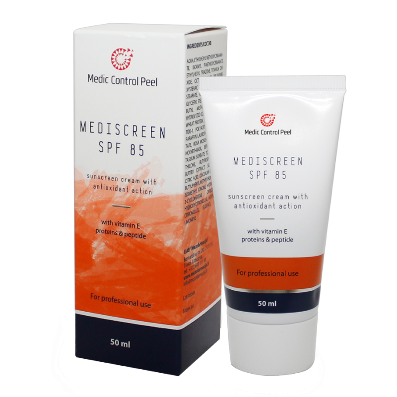 Mediscreen SPF 85 ist für alle Hauttypen geeignet. Die Sonnenschutzcreme setzt sich aus physikalischen und chemischen Filtern zusammen und bietet maximalen Lichtschutz für das gesamte Spektrum an ultravioletten Strahlen (SPF 85 auf der COLIPA-Skala). Aufgrund des zusammengesetzten Tripeptid-1 hat sie eine ausgeprägte regenerierende, antioxidative und feuchtigkeitsspendende Wirkung. Die Creme zieht schnell ein und hinterlässt keinen Fettglanz.